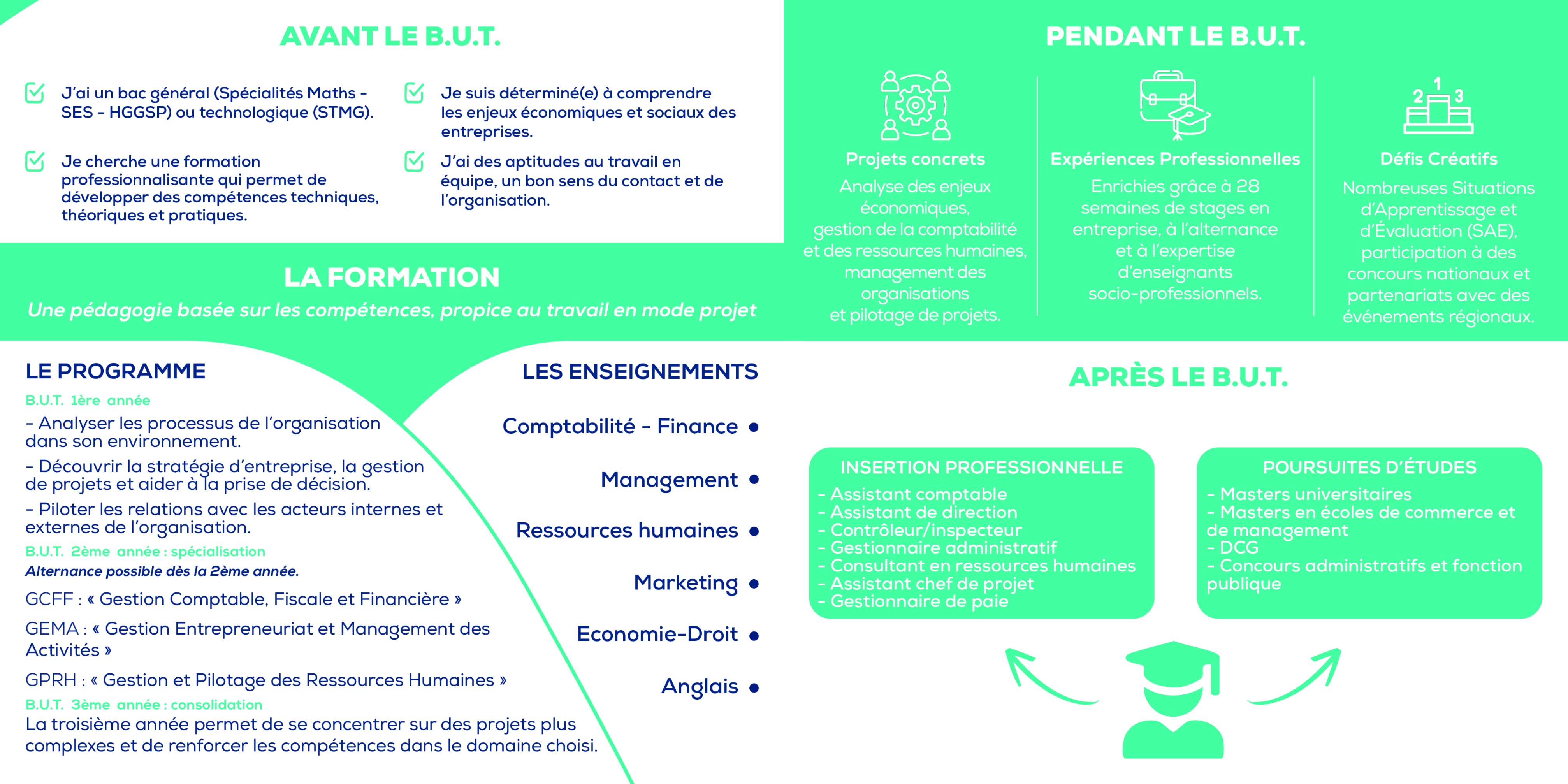 Le BUT a pour vocation de former des jeunes cadres et managers pouvant exercer leur expertise dans les domaines de la comptabilité, du management financier, de la communication, du marketing et des ressources humaines.