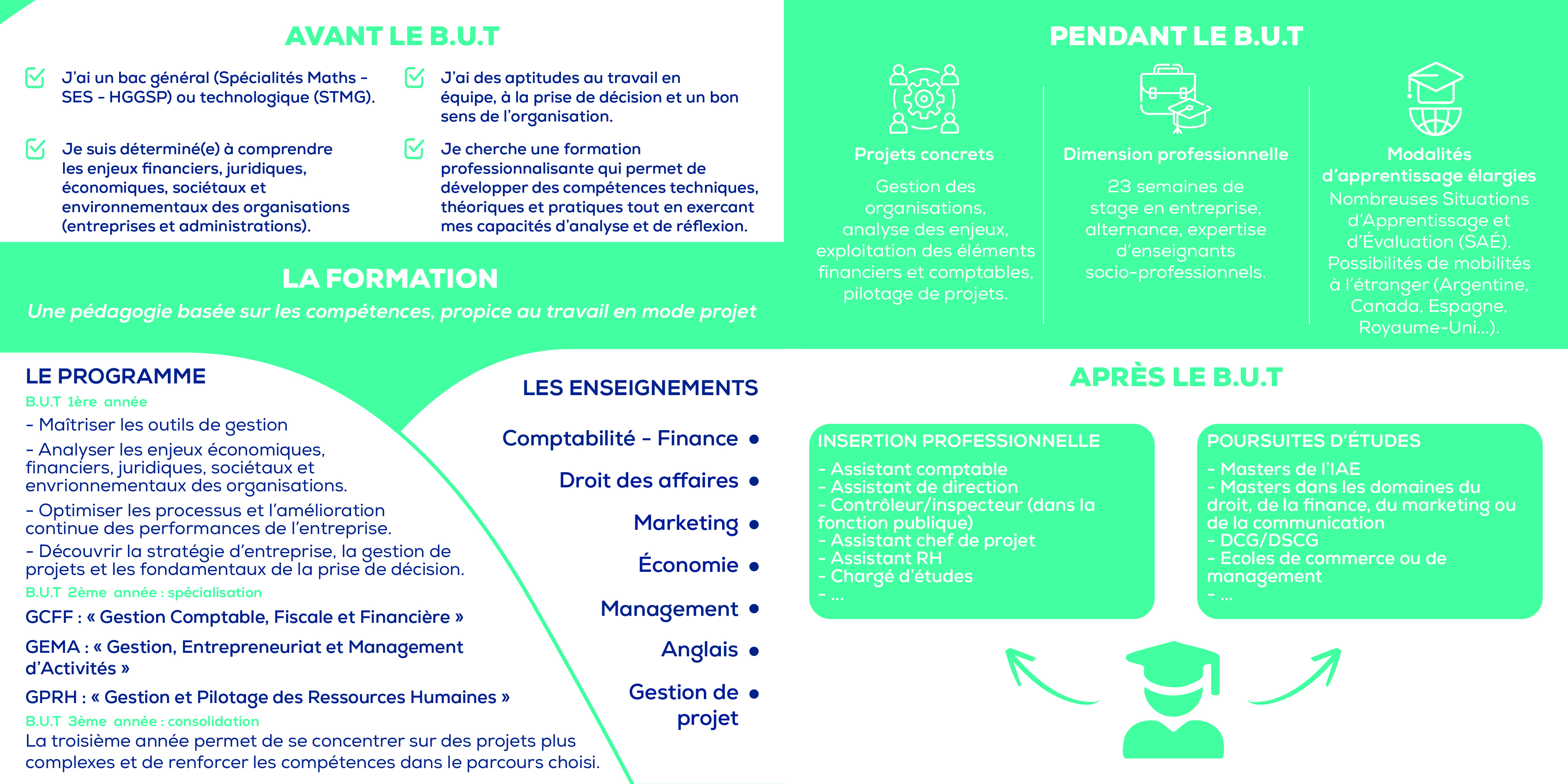 Le Bachelor Universitaire de Technologie (BUT) a pour vocation de former en trois ans des cadres intermédiaires et managers pouvant exercer leur expertise dans les domaines de la gestion et du management financier, de l’entrepreneuriat et des ressources humaines.