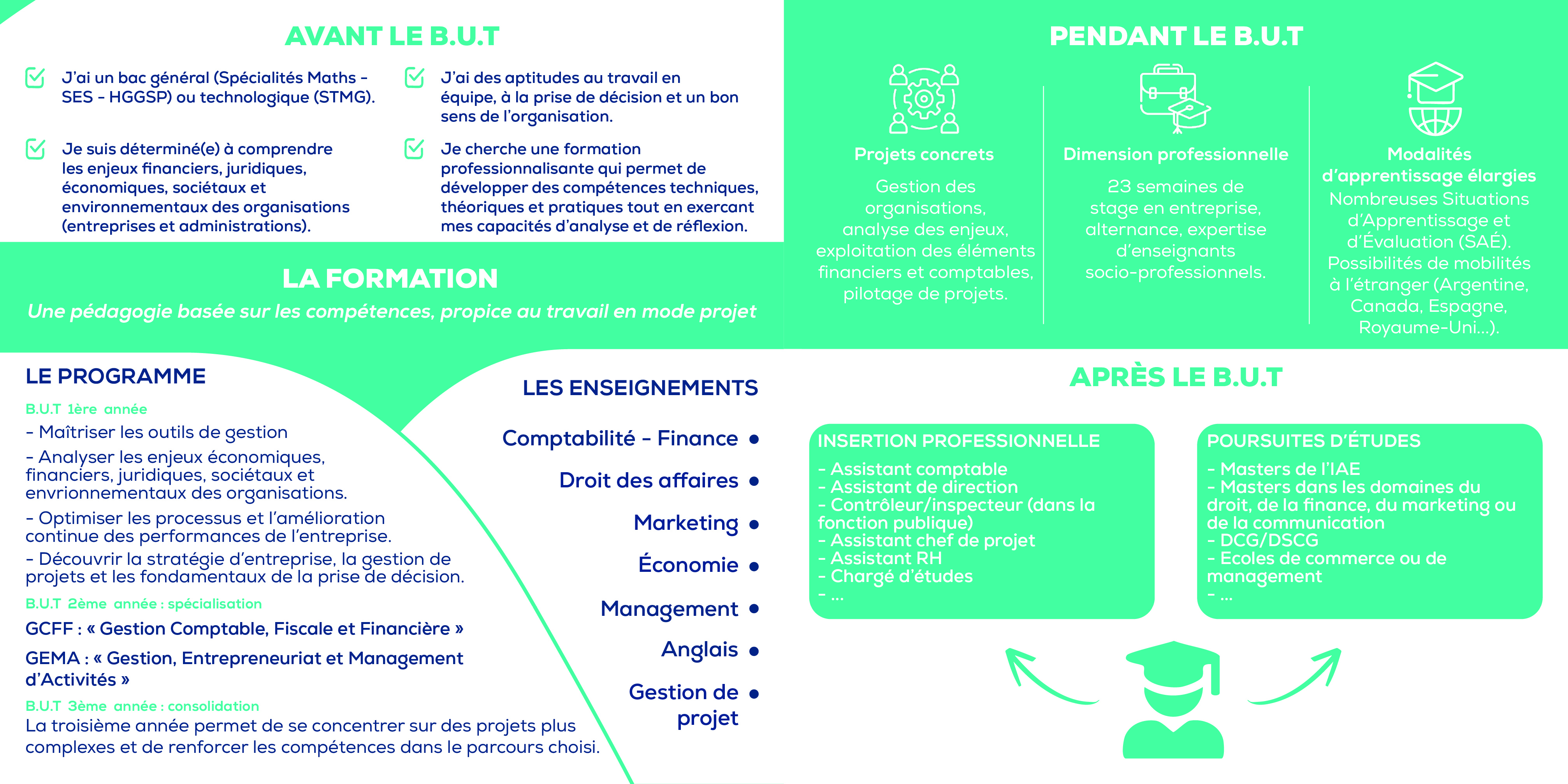 Le Bachelor Universitaire de Technologie (BUT) a pour vocation de former en trois ans des cadres intermédiaires et managers pouvant exercer leur expertise dans les domaines de la gestion et du management financier, de l’entrepreneuriat et des ressources humaines.